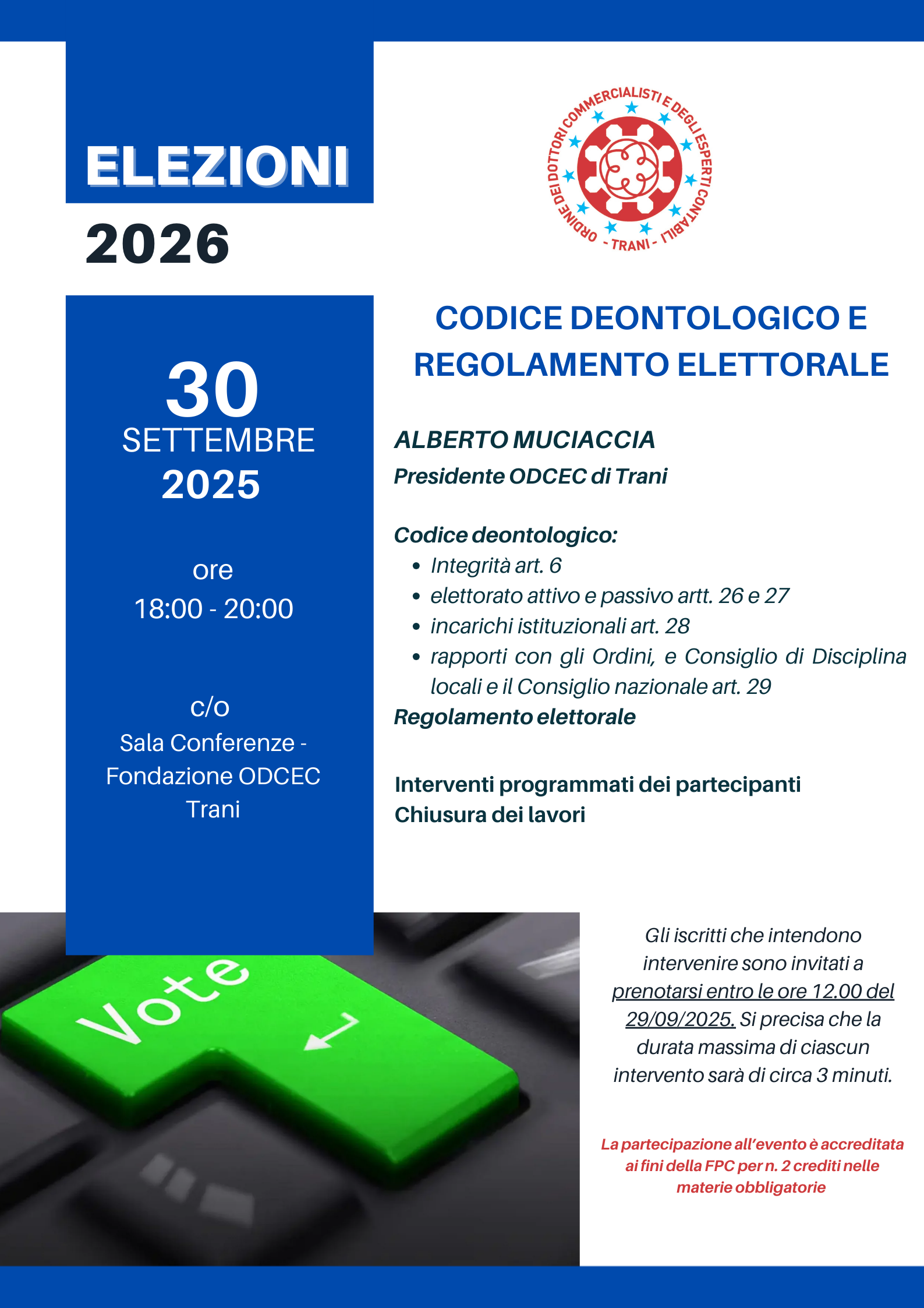 Il giorno 30.09.2025 dalle ore 18:00 alle ore 20.00, c/o la sede dell'ODCEC di Trani.